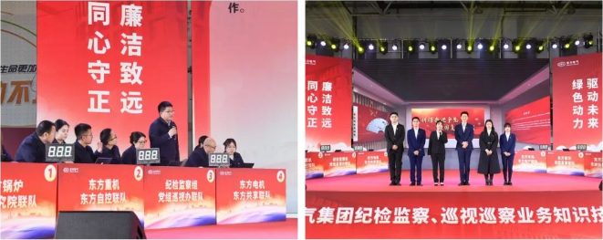 精兵聚、竞锋芒!8支代表队在团体赛中激烈比拼,赛出了扎实严谨的专业素养,赛出了昂扬向上的精神风貌。6名优秀讲解员在个人赛中生动呈现廉洁东方电气展馆特色亮点,宣讲“同心守正 廉洁致远”廉洁理念。比赛高潮迭起、精彩纷呈。